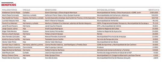 Hermanos, convivientes y cuñados de legisladores oficialistas de Perú Libre, Bloque Magisterial y Perú Democrático aparecen entre los beneficiados con millonarias adjudicaciones.