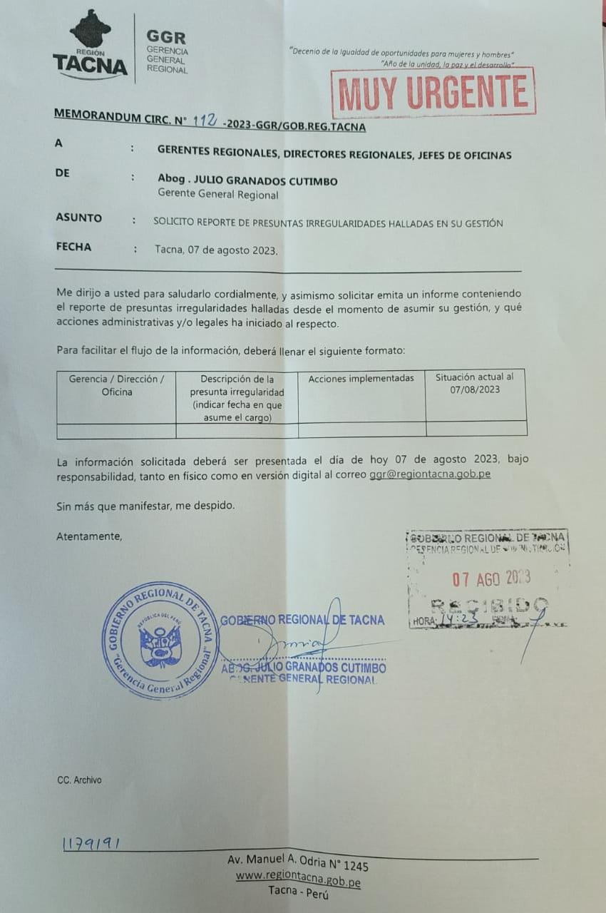 El gerente Granados emitió el Memorándum Circ. N° 4112-2023-GGR/GOB.REG.TACNA donde solicita a su personal de confianza detallar las irregularidades encontradas y qué acciones implementaron.