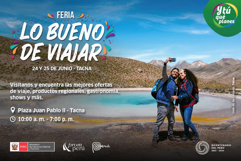 ¡La Feria Lo Bueno de Viajar llega a Tacna! La feria se realizará los días 24 y 25 de junio en la Plaza Juan Pablo II y contará con las mejores ofertas de viajes a todos los rincones del Perú.