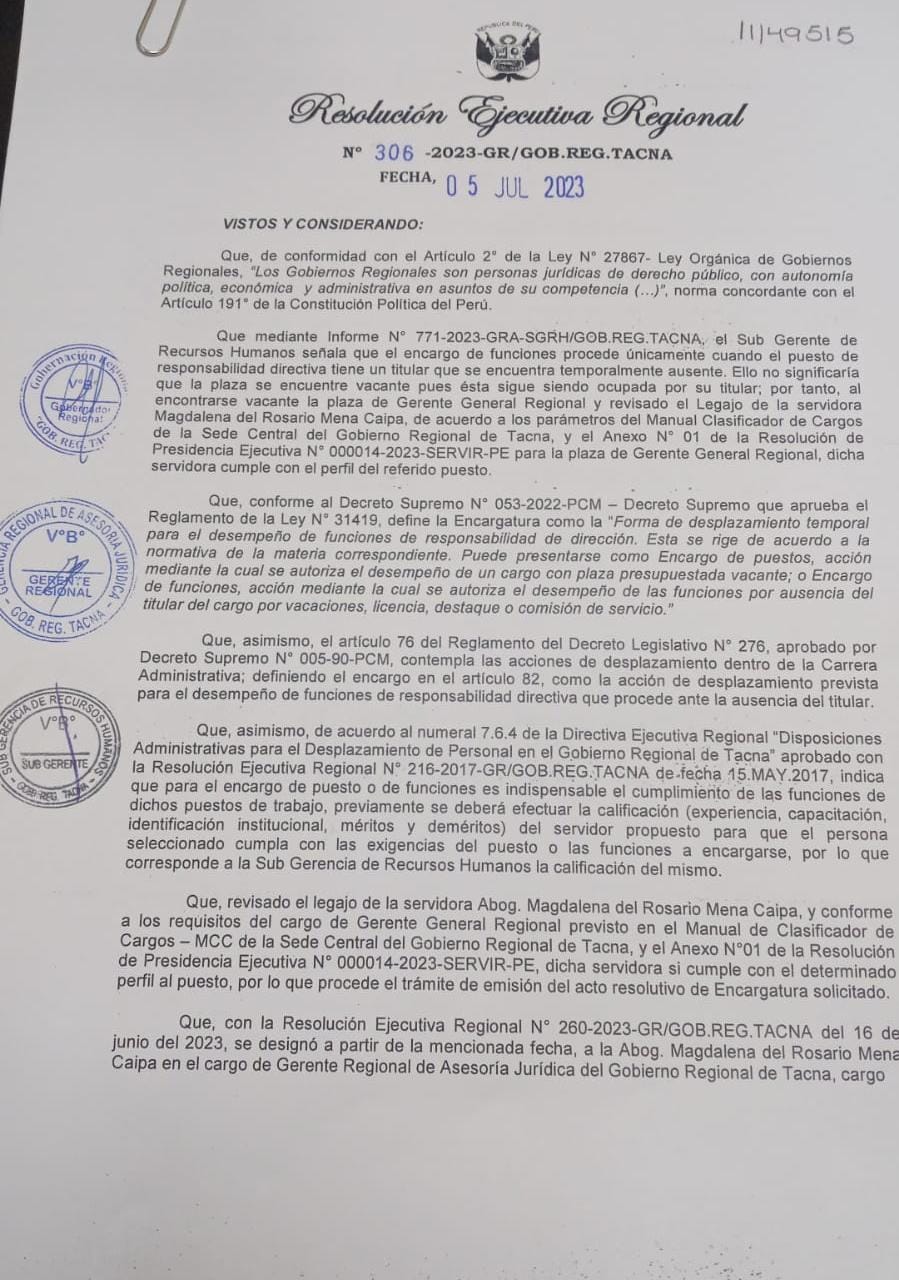 ARTÍCULO PRIMERO.- ENCARGAR a partir de la fecha, a la Abog. MAGDALENA DEL ROSARIO MENA CAIPA, en adición a sus funciones como Gerente Regional de Asesoría Jurídica del Gobierno Regional de Tacna, el cargo de GERENTE GENERAL REGIONAL del Gobierno Regional de Tacna, debiendo cumplir con las obligaciones inherentes al cargo y a la ley, reza la Resolución Ejecutiva Regional número 306.2023-GR/GOB.REG.TACNA, emitida por la Profesora Liliana del Carmen Velazco Cornejo, gobernadora regional PROVISIONAL de Tacna.
