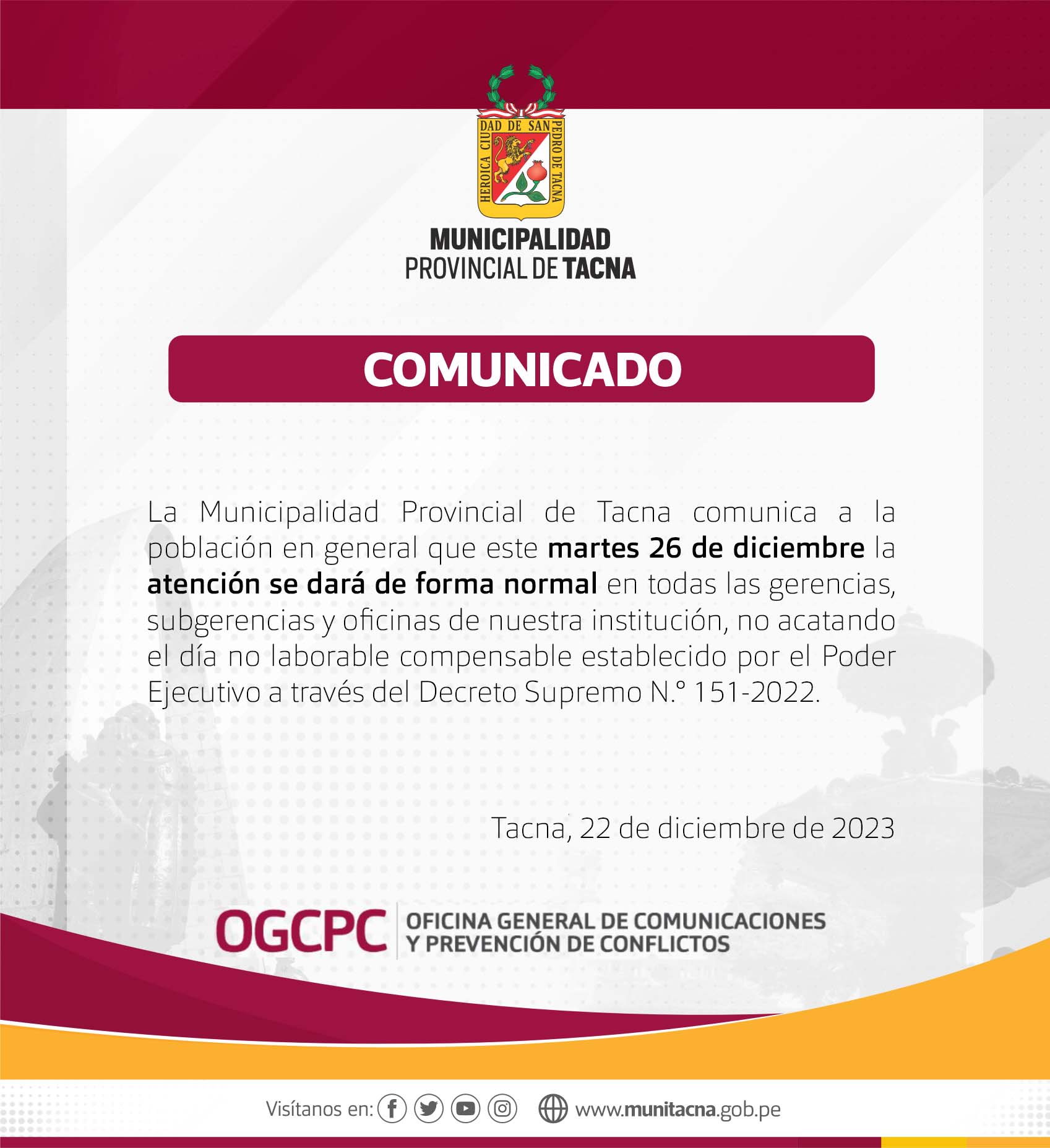 La Municipalidad Provincial de Tacna anunció que este martes 26 de diciembre, feriado no laborable compensable para el sector público, la atención se dará de manera normal en todas sus dependencias.