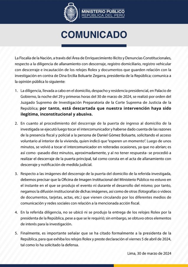 "La Fiscalía de la Nación, a través del Área de Enriquecimiento ilícito y Denuncias Constitucionales, respecto a la diligencia de allanamiento con descerraje, registro domiciliario, registro vehicular con descerraje e incautación de los relojes Rolex y documentos que guarden relación con la investigación en contra de Dina Ercilia Boluarte Zegarra, presidenta de la República; comunica a la opinión pública lo siguiente: