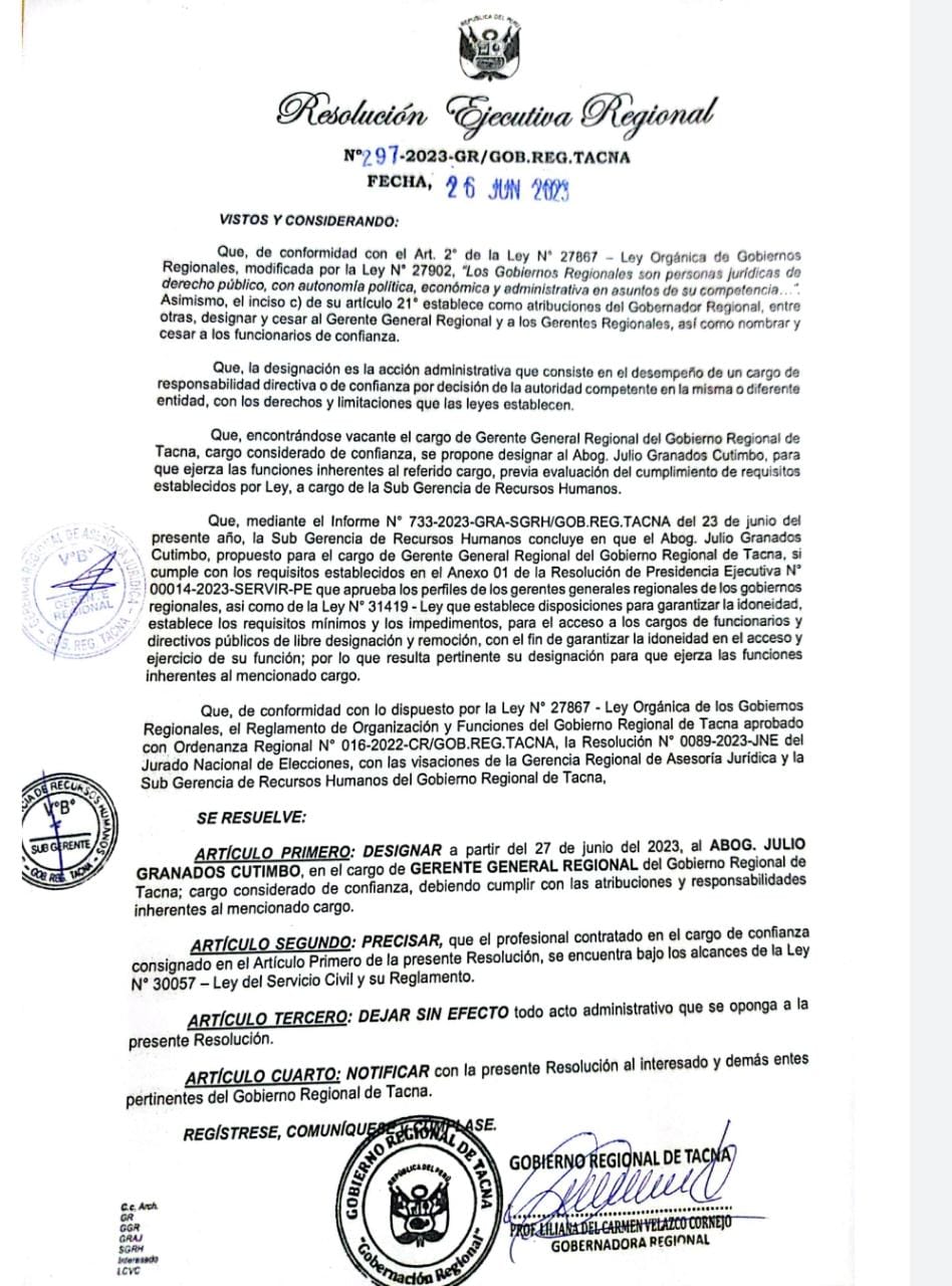 Liliana Velazco, Gobernadora Regional Provisional, designó al abogado Julio Granados Cutimbo como nuevo gerente general. Granados asume tras la renuncia de Saúl Quintanilla Zeballos, quien dimitió tras conocerse que había sido condenado a prisión condicional por colusión.