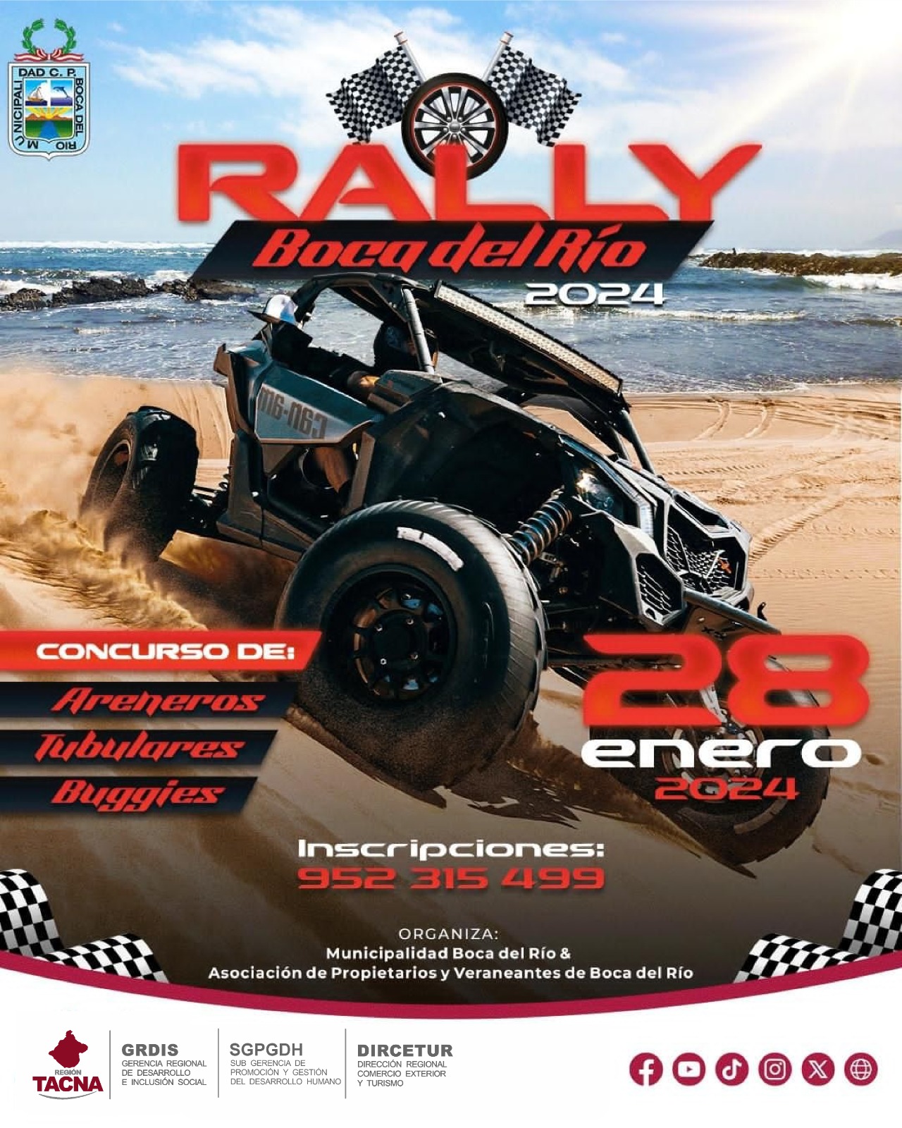 La Municipalidad de Boca del Río y la Asociación de Propietarios y Veraneantes de Boca del Río, invitan a todos los amantes de la velocidad a participar en el Rally Boca del Río 2024, el cual se llevará a cabo el próximo 28 de enero del 2024.