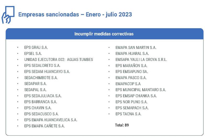 En caso de incumplimiento en el plazo establecido, la Sunass inicia procesos administrativos sancionadores que podrían derivar en multas o amonestación. Entre 2020 y julio de 2023, la Sunass aplicó 249 sanciones por el incumplimiento de medidas correctivas.