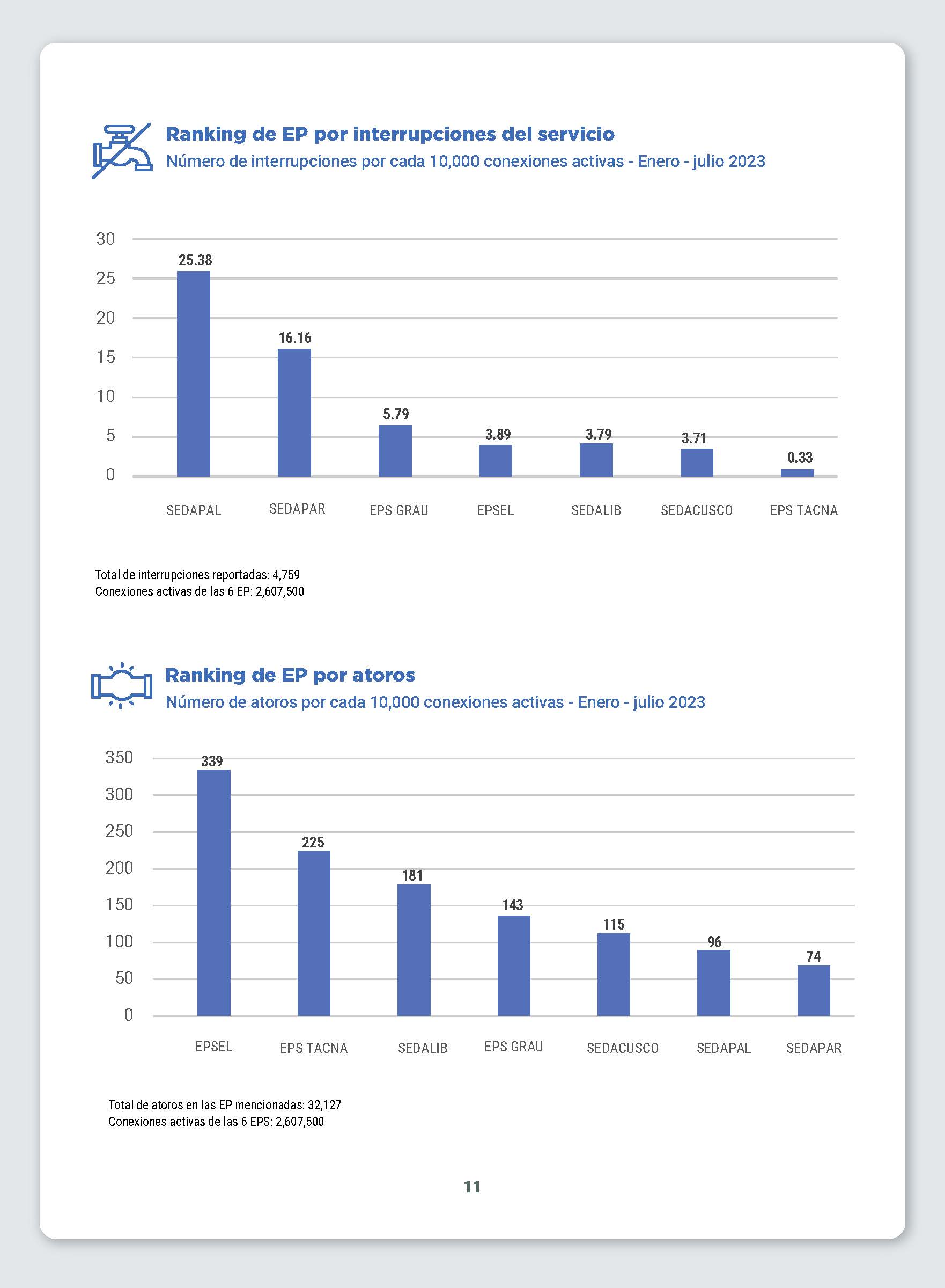 A Sedapal, el prestador más grande del país, se le impuso 111 medidas correctivas, la mayoría referida a aspectos comerciales (39 %) —como facturaciones— y operacionales (39 %) —como mantenimiento de redes—, tratamiento de agua potable (15 %), tratamiento de aguas residuales (5 %) y uso de fondos de inversiones (2 %).