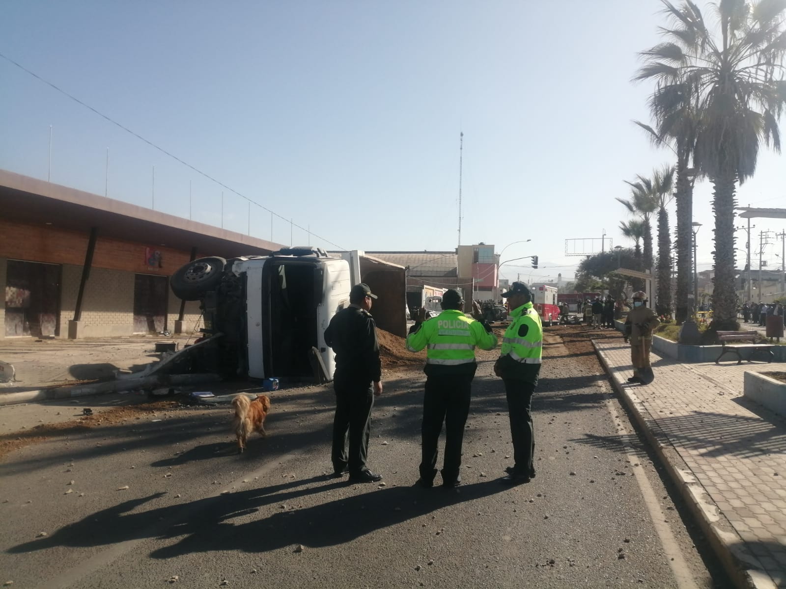 Producto de la velocidad del volquete, este termino derribando un poste de tensión baja de Electrosur, afectando el servicio de energía eléctrica en la zona.