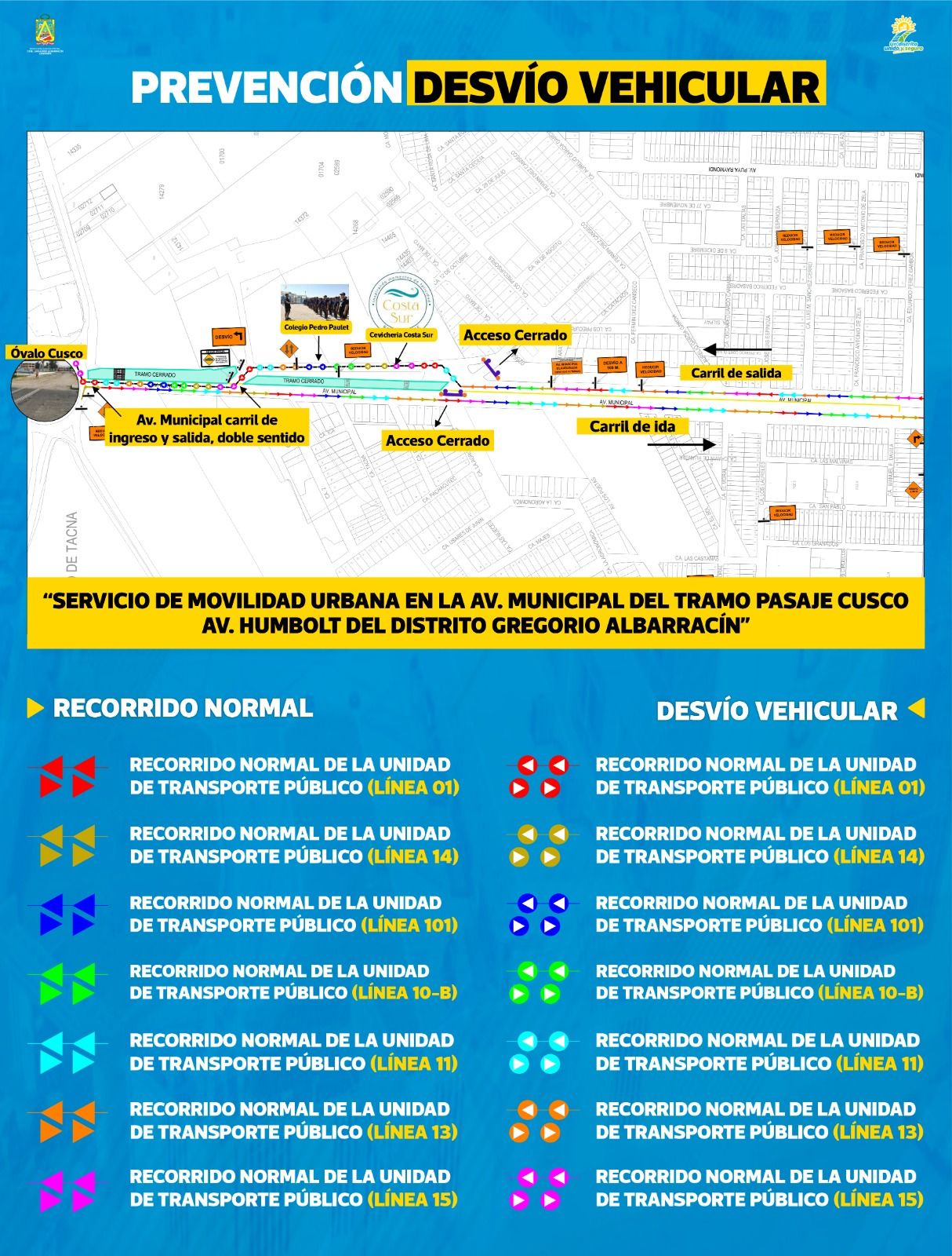 La Municipalidad Distrital Coronel Gregorio Albarracín Lanchipa ha anunciado un plan de desvío temporal en la Avenida Municipal, debido a los trabajos de la obra "Mejoramiento y ampliación de los servicios de movilidad urbana en la avenida Municipal". La medida regirá a partir de este miércoles 18 de junio y afectará el tramo III de salida del distrito, ubicado entre el pasaje Cusco (altura de SENASA) y el óvalo Cusco.