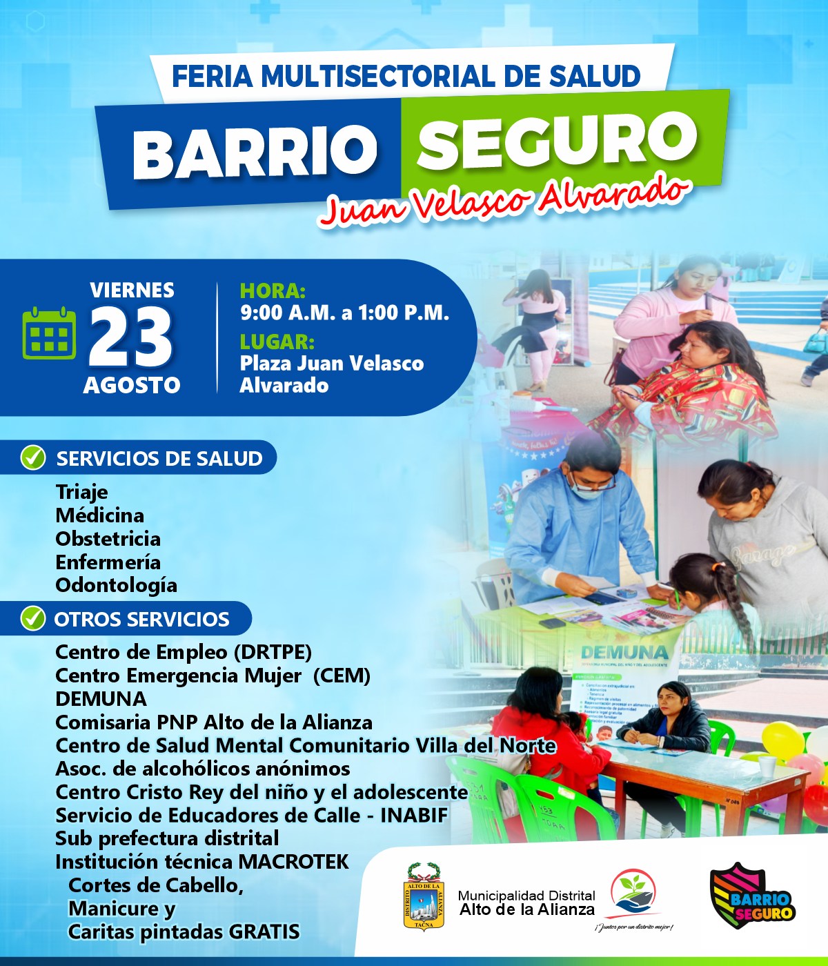 Este viernes 23 de agosto, los vecinos del Barrio Seguro Juan Velasco Alvarado tendrán la oportunidad de acceder a una amplia gama de servicios de manera gratuita. La Municipalidad Distrital de Alto de la Alianza, en coordinación con diversas instituciones, ha organizado una feria multisectorial que se llevará a cabo en la Plaza Juan Velasco Alvarado, desde las 9:00 a.m. hasta la 1:00 p.m.