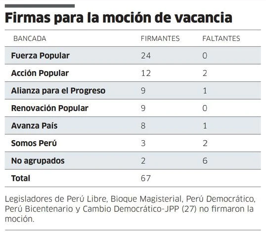 Pese a que la moción solo tiene 67 firmas de congresistas de AP, APP, Renovación Popular, Fuerza Popular, Avanza País y Somos Perú, Málaga aseguró que “hoy tenemos un número que sobrepasa con holgura los 87 votos” y recordó que algunos congresistas que no han firmado la moción se han comprometido a votar por la vacancia.