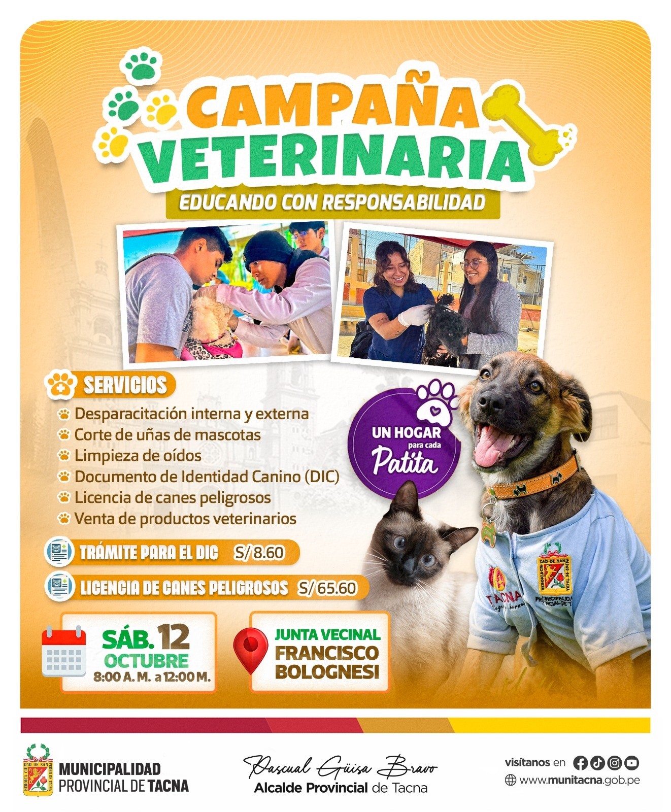 Este sábado 12 de octubre, la Municipalidad de Tacna, a través de su Unidad de Gestión de Salud Pública, llevará a cabo una importante campaña veterinaria en la loza deportiva de la Junta Vecinal Francisco Bolognesi.