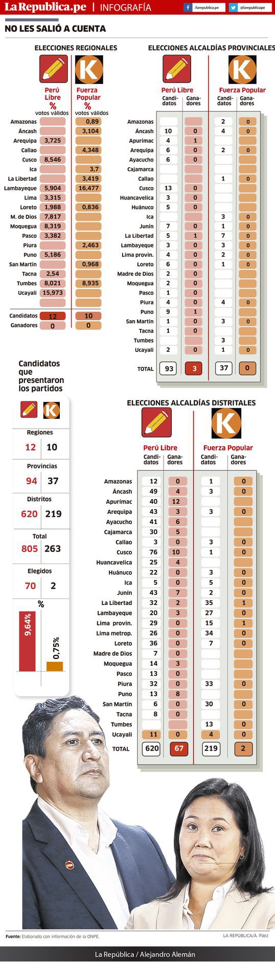Los dos partidos que disputaron la Presidencia hace poco más de un año recibieron votaciones exiguas: del total de los candidatos que presentaron a los gobiernos regionales, provinciales y distritales, fueron elegidos el 8,69%, en el caso de Perú Libre, y el 0,76% respecto a Fuerza Popular.