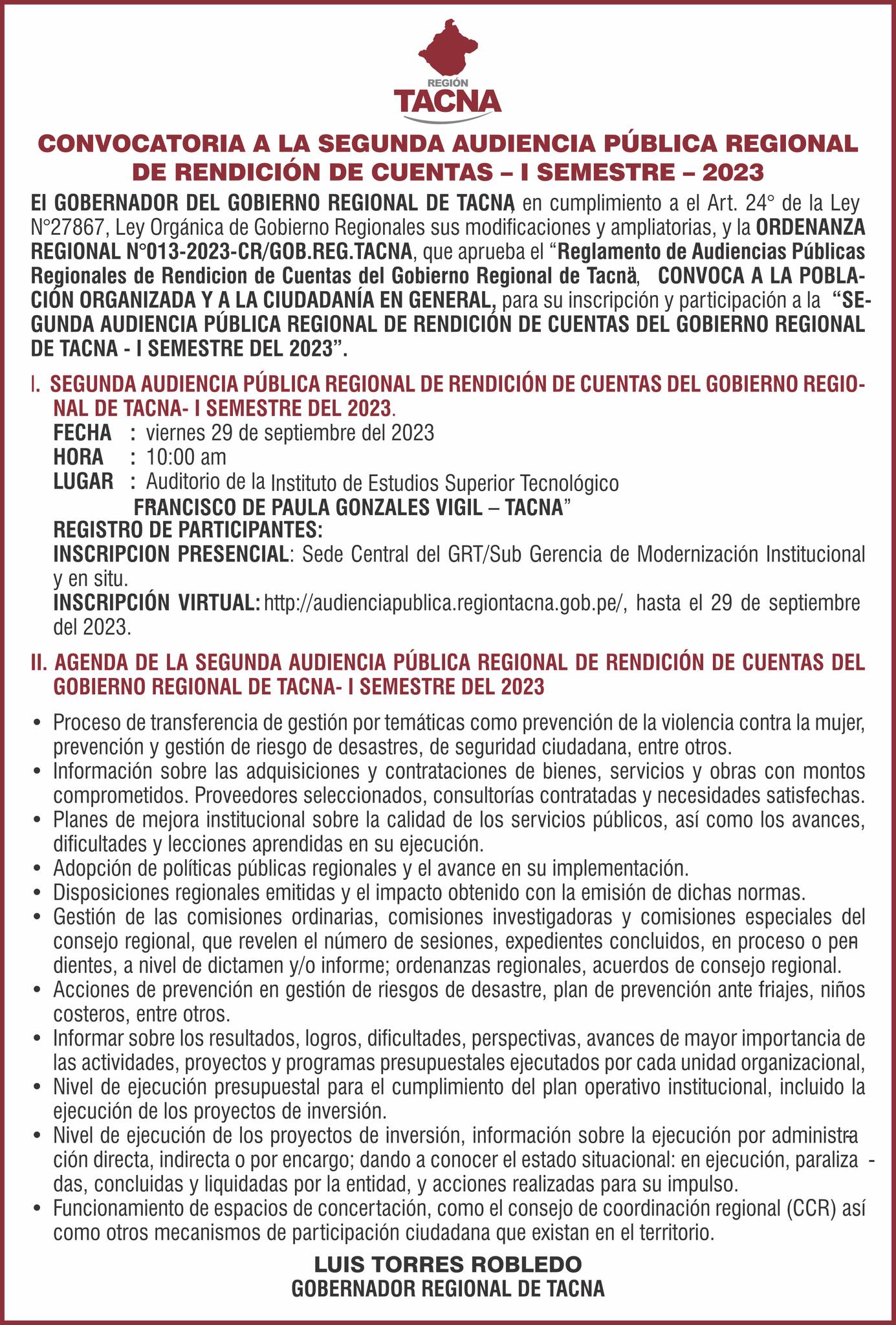 El Gobierno Regional de Tacna, a través del gobernador Luis Torres Robledo, convoca a la segunda audiencia pública regional de rendición de cuentas correspondiente al I Semestre de 2023.