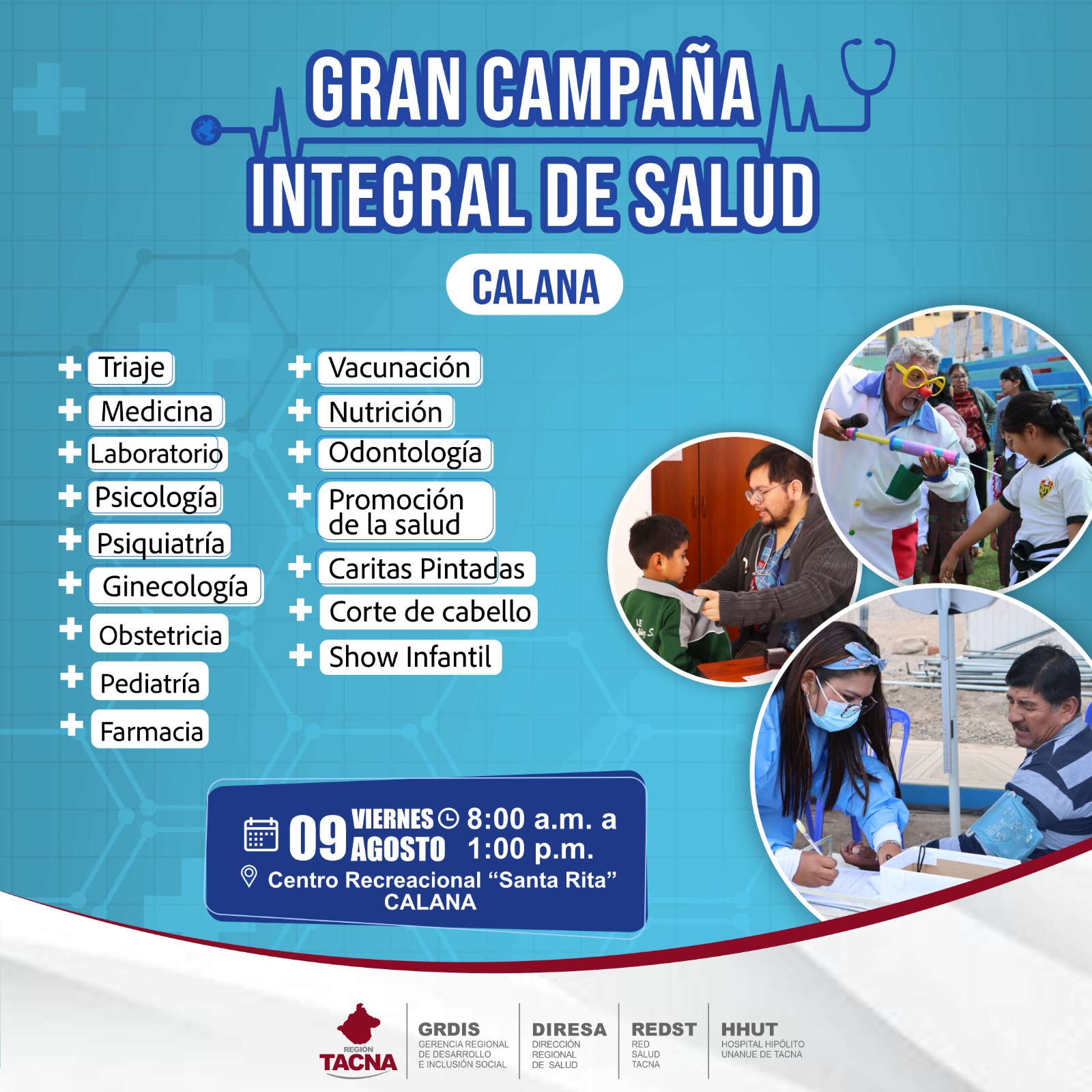 Organizada por la Gerencia Regional de Desarrollo e Inclusión Social - GORE TACNA, en conjunto con la Diresa Tacna, la Red de Salud Tacna y el Hospital Hipólito Unanue, esta campaña ofrecerá una amplia gama de servicios, entre los que destacan: