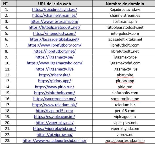 Los sitios webs piratas ‘afectados’ con esta medida venían siendo utilizados por miles de usuarios de manera gratuita. Entre las más conocidas figuran ‘Roja Directa’, ‘Pirlo TV’, ‘Fútbol para Todos’, ‘Libre Fútbol’. Aquí la lista completa.