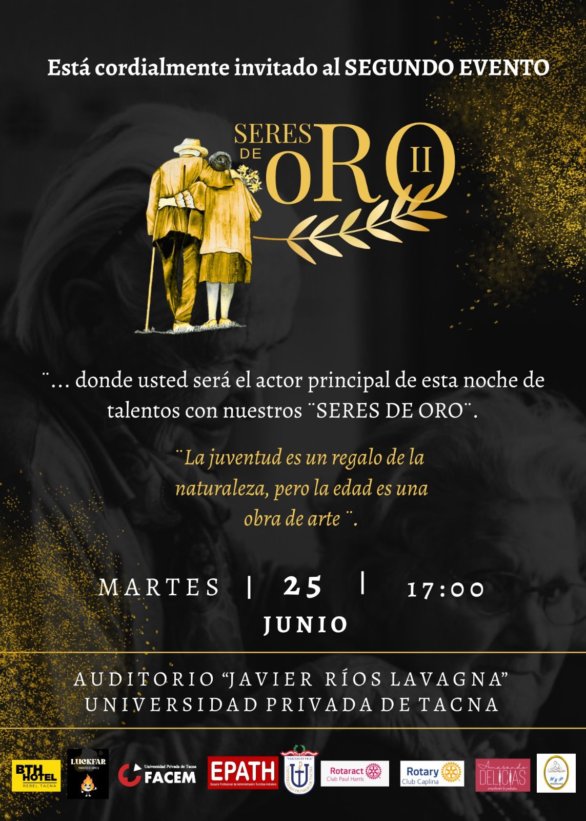 Estudiantes de la carrera de Administración Turística Hotelera de la Universidad Privada de Tacna (UPT), junto al apoyo del Rotary Club Caplina y Rotarac, se complacen en anunciar la II Edición del Festival de Talentos "Seres de Oro".