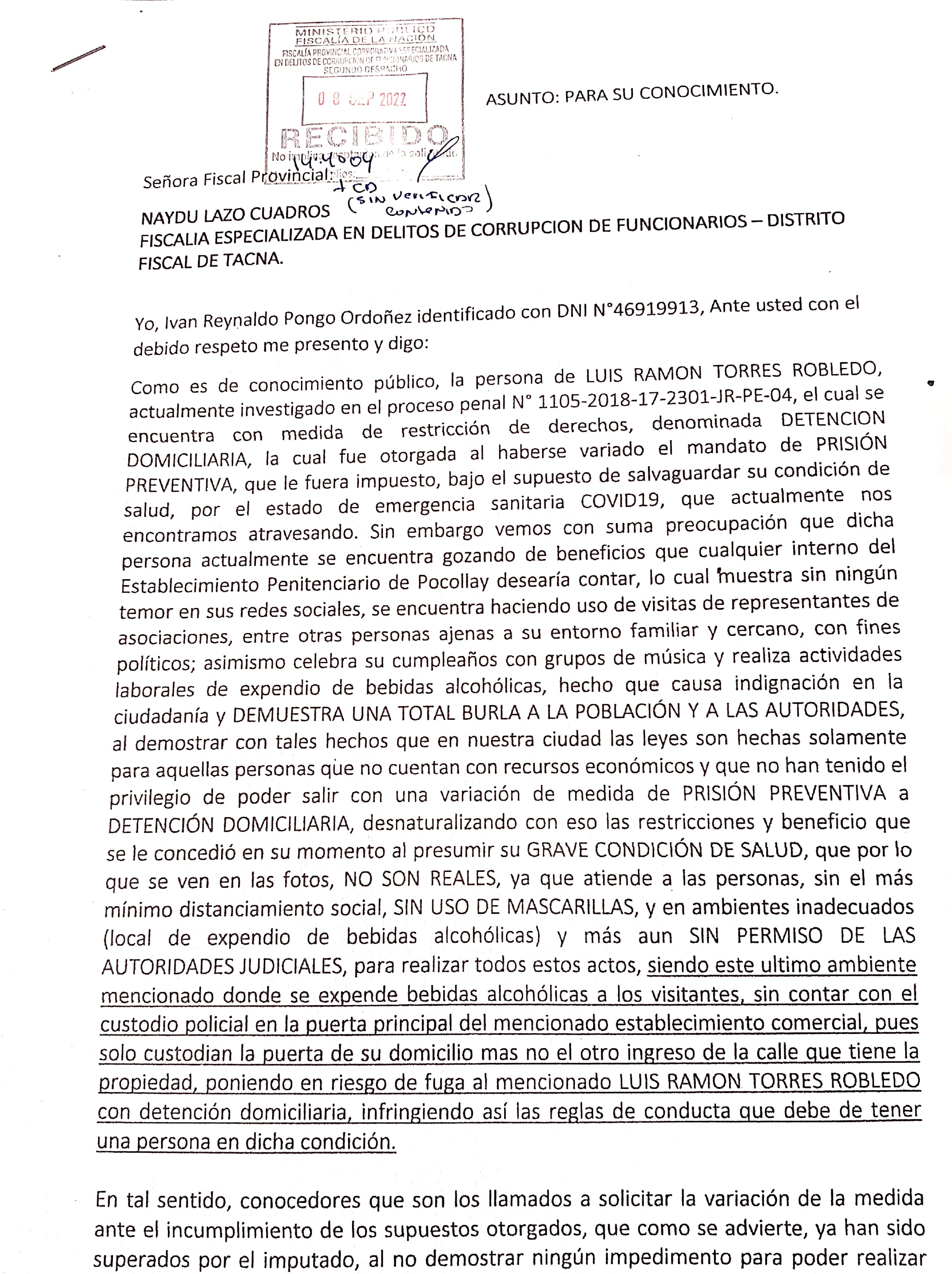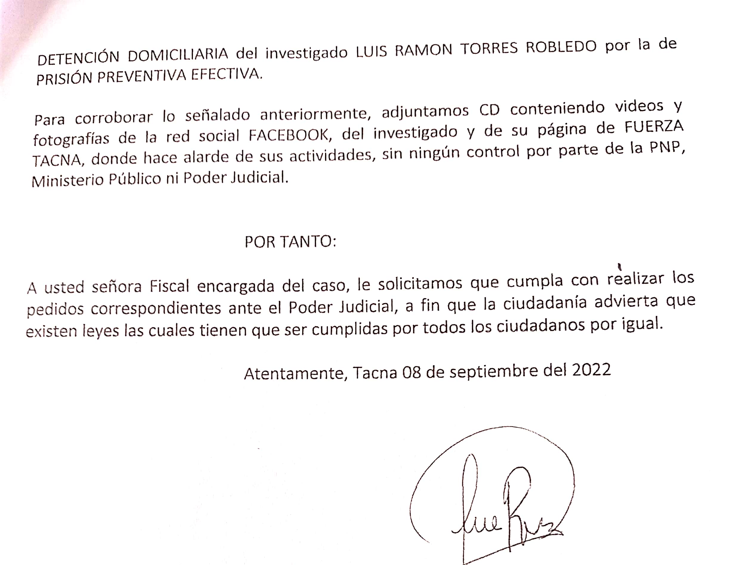Ciudadano indignado presenta solicitud para variar la detención domiciliaria por prisión preventiva en el penal de Pocollay para Torres Robledo, al haber incumplido las reglas de conducta indicadas claramente en el arresto domiciliario de Luis Ramón Torres Robledo.