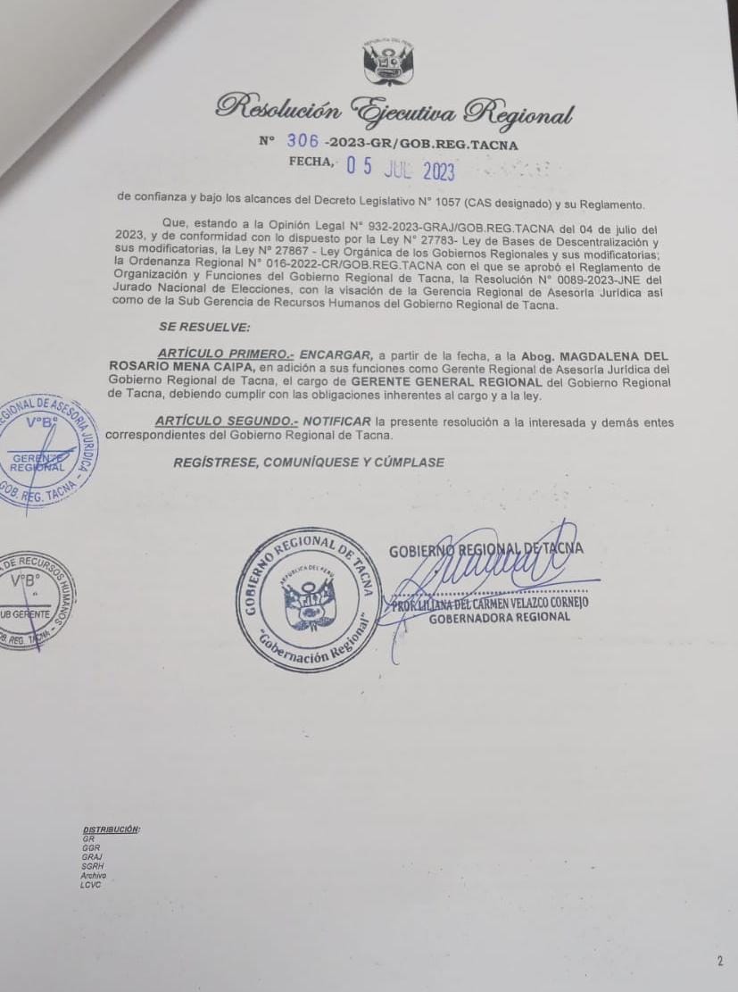 ARTÍCULO PRIMERO.- ENCARGAR a partir de la fecha, a la Abog. MAGDALENA DEL ROSARIO MENA CAIPA, en adición a sus funciones como Gerente Regional de Asesoría Jurídica del Gobierno Regional de Tacna, el cargo de GERENTE GENERAL REGIONAL del Gobierno Regional de Tacna, debiendo cumplir con las obligaciones inherentes al cargo y a la ley, reza la Resolución Ejecutiva Regional número 306.2023-GR/GOB.REG.TACNA, emitida por la Profesora Liliana del Carmen Velazco Cornejo, gobernadora regional PROVISIONAL de Tacna.