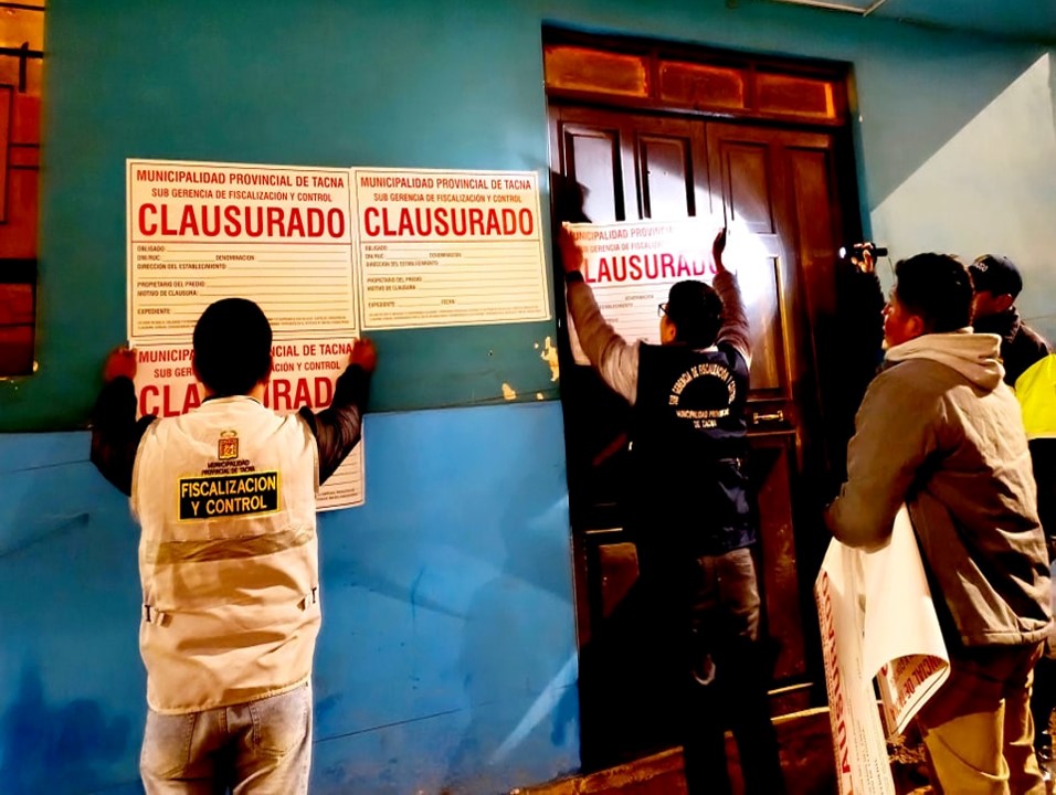 En un operativo conjunto realizado la noche del jueves, la Municipalidad de Tacna, a través de sus diversas áreas de fiscalización, clausuró el establecimiento conocido como "Las Caribeñas", por operar como bar-cantina sin contar con la licencia de funcionamiento correspondiente.