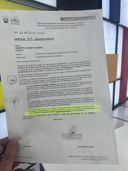 Por medio de un oficio, registrado el 10 de julio, la jefa del Departamento de Recursos Humanos del Congreso, Haidy Figueroa, mencionó que el petitorio del ex jefe de Estado fue derivado a su despacho para evaluar y emitir las conclusiones correspondientes.