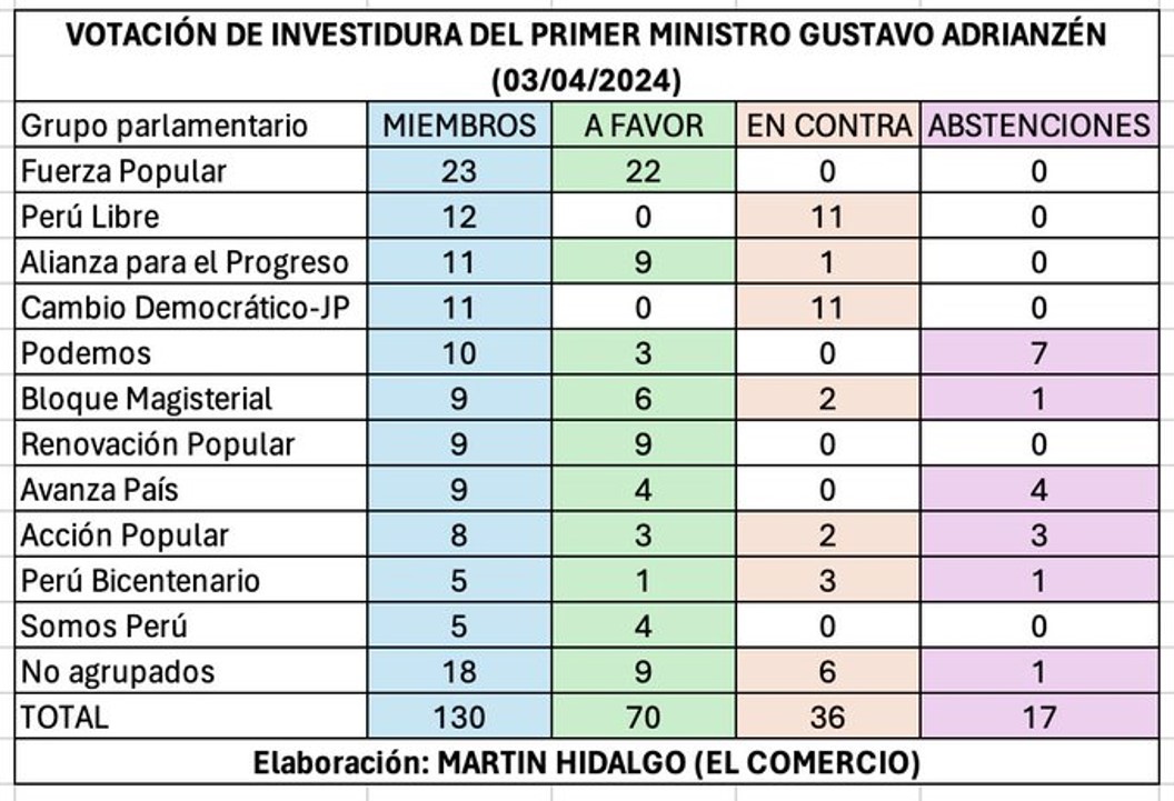 Con 70 votos a favor, 36 en contra y 17 abstenciones, la representación nacional aprobó otorgar la investidura al Gabinete Adrianzén, ello tras un amplio debate que se prolongó por más de cuatro horas.