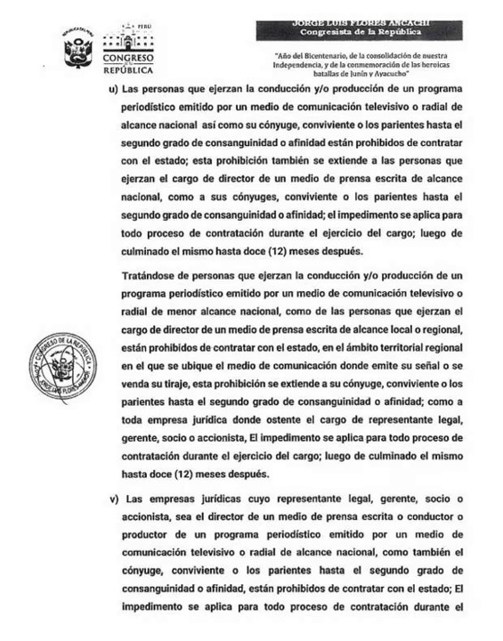 La iniciativa legislativa 07437/2023-CR incorpora dos literales al artículo 11 de la Ley 30225 que establecen prohibiciones a periodistas en actividad y a “los cónyuges, conviviente o los parientes hasta el segundo grado de consanguinidad o afinidad, como a las empresas jurídicas en las cuales estos pueden formar parte como socios, accionistas, representantes legales y gerentes de contratar con el Estado”.