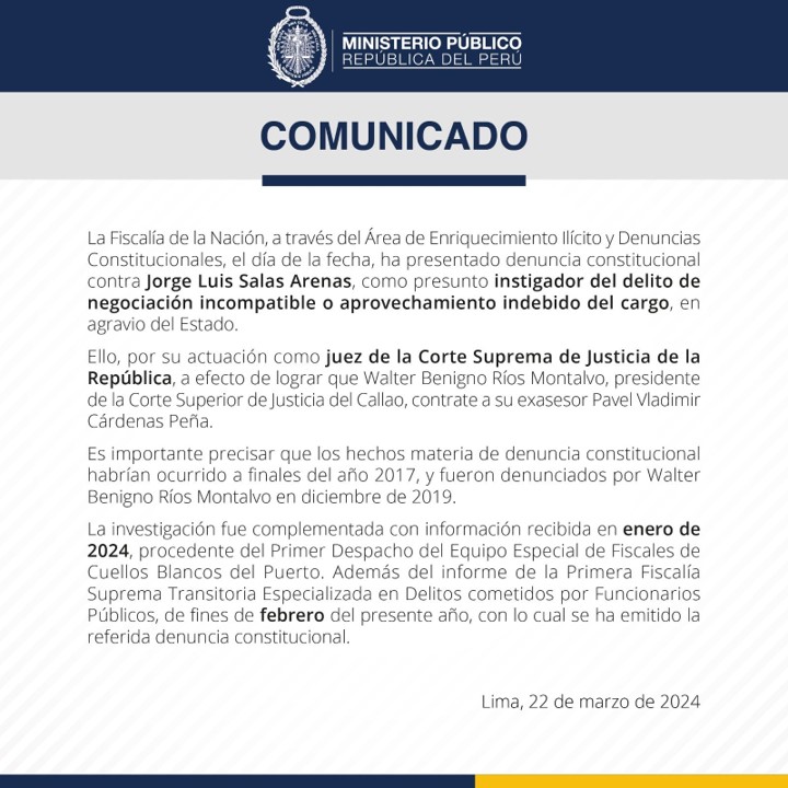 La Fiscalía de la Nación, a través del Área de Enriquecimiento Ilícito y Denuncias Constitucionales, presentó una denuncia constitucional contra Jorge Luis Salas Arenas, como presunto instigador del delito de negociación incompatible o aprovechamiento indebido del cargo, en agravio del Estado.