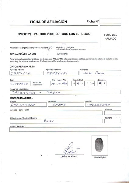 Pese a estar encerrado en el penal Barbadillo, ubicado en el distrito de Ate, por ser sindicado de los delitos de rebelión, tras el golpe de Estado el pasado 7 de diciembre del año 2022, y corrupción por presumiblemente ser cabecilla de una organización criminal enquistada en el Palacio de Gobierno, el expresidente Pedro Castillo anunció su afiliación al partido político ‘Todo con el Pueblo’.