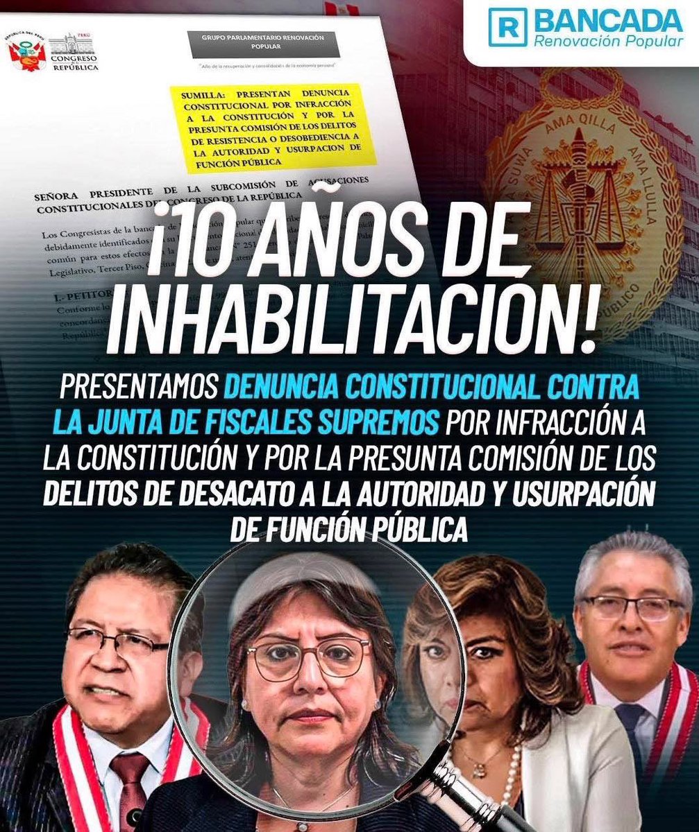 Por tal hecho, los miembros de Renovación Popular han solicitado a la Subcomisión de Acusaciones Constitucionales (SAC) que ponga en trámite esta denuncia con celeridad. El objetivo es lograr la inhabilitación por 10 años de la función pública de los mencionados fiscales por presunta "desobediencia a la autoridad y usurpación de la función pública".