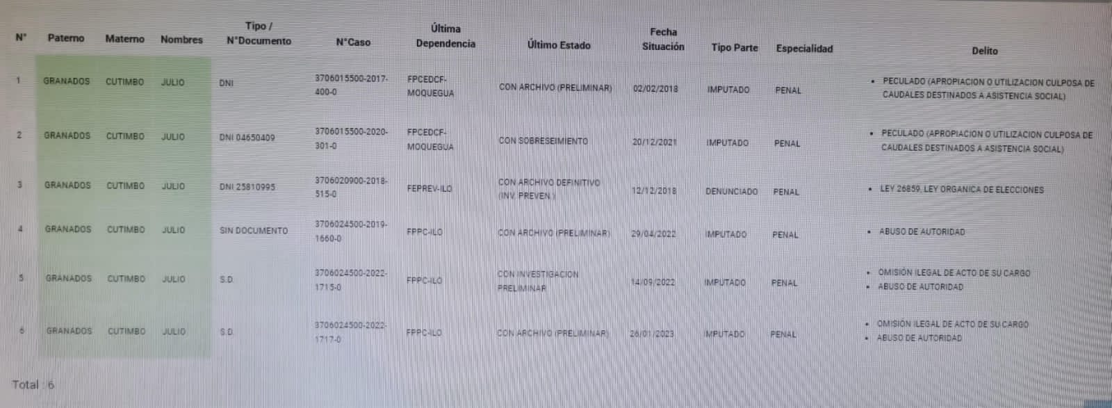 Según información a la que tuvo acceso Radio La Estación, Julio Granados Cutimbo contaría con hasta 6 investigaciones en su contra como imputado y denunciado en Moquegua e Ilo.