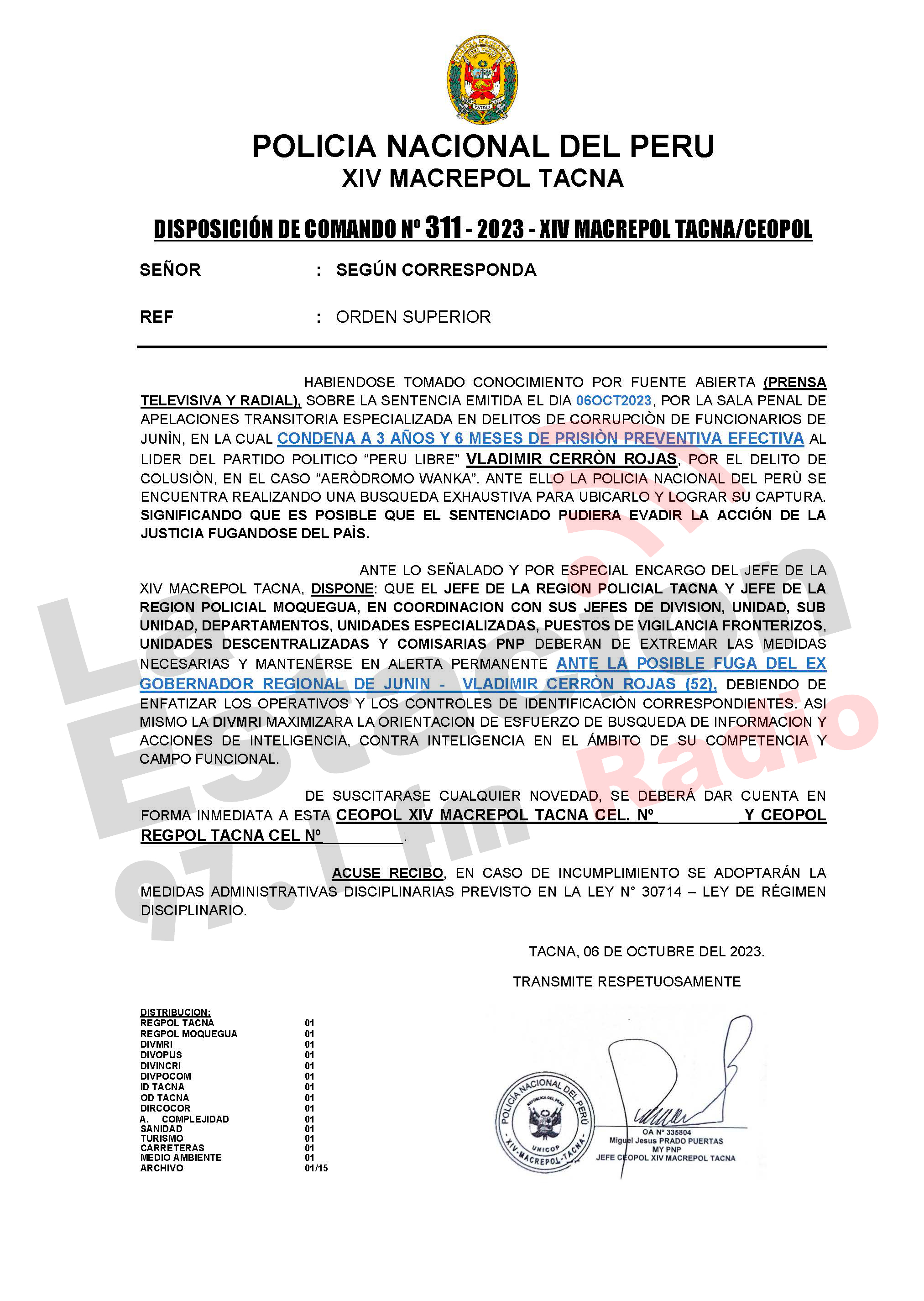 "Cualquier novedad deberá ser informada inmediatamente a la CEOPOL XIV Macro Región Policial Tacna y CEOPOL Regpol Tacna", señala la disposición.