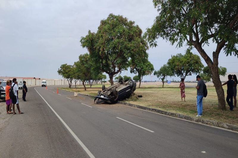 De milagro un agente de la Policía Nacional sobrevivió al aparatoso vuelco del automóvil que conducía la mañana de este jueves por la carretera Panamericana, al costado de la Zofra Tacna.