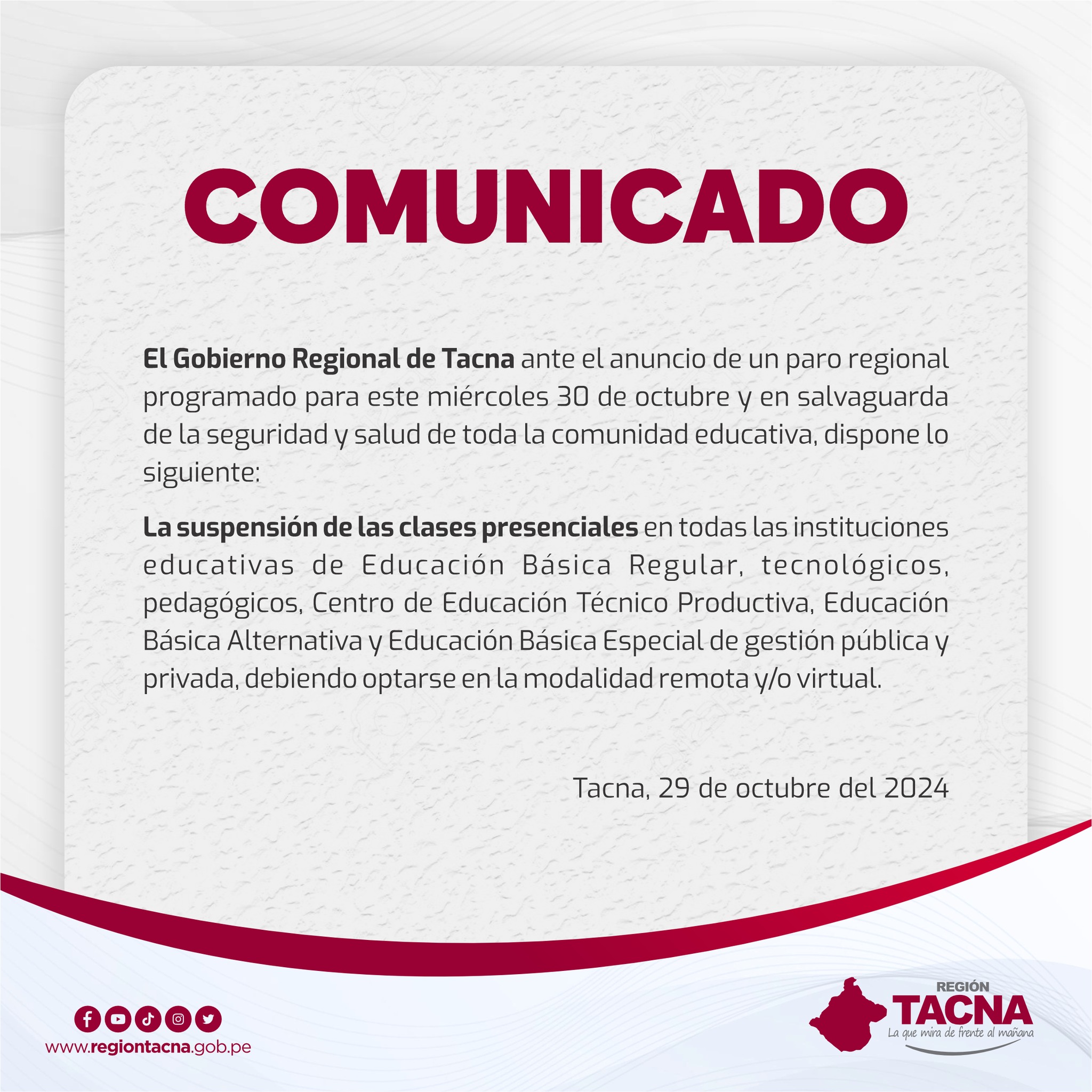 Ante la convocatoria a un paro regional para este miércoles 30 de octubre, el Gobierno Regional de Tacna ha decidido suspender las clases presenciales en todos los niveles educativos, desde inicial hasta superior, tanto en instituciones públicas como privadas. Esta medida, según informaron las autoridades regionales, busca garantizar la seguridad y el bienestar de toda la comunidad educativa ante las posibles movilizaciones y bloqueos programados para esa fecha.