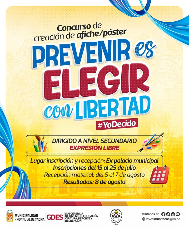 La Municipalidad Provincial de Tacna, a través de la Unidad de Desarrollo de Oportunidades Juveniles, invita a los estudiantes de secundaria a participar en el concurso de creación de afiches/póster "Prevenir es elegir con libertad".