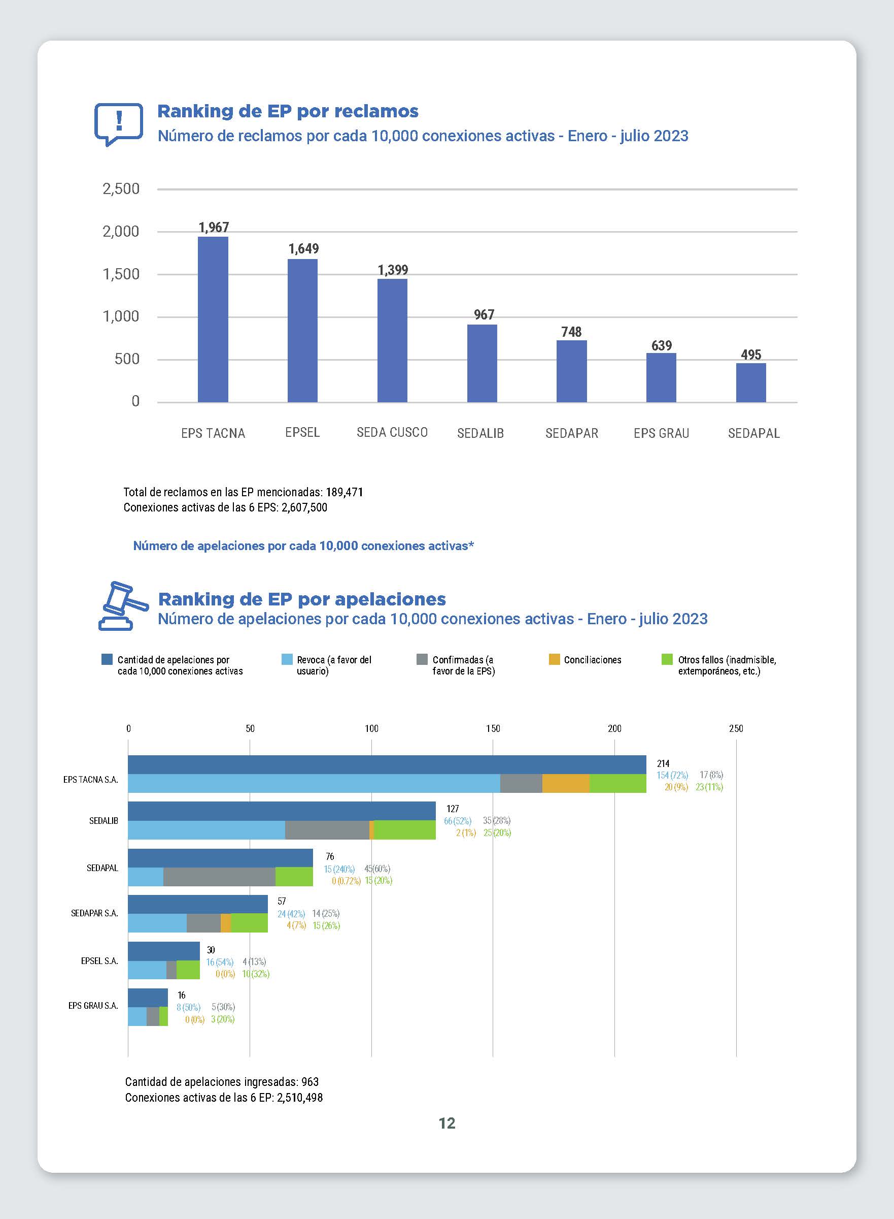 A Sedapal, el prestador más grande del país, se le impuso 111 medidas correctivas, la mayoría referida a aspectos comerciales (39 %) —como facturaciones— y operacionales (39 %) —como mantenimiento de redes—, tratamiento de agua potable (15 %), tratamiento de aguas residuales (5 %) y uso de fondos de inversiones (2 %).