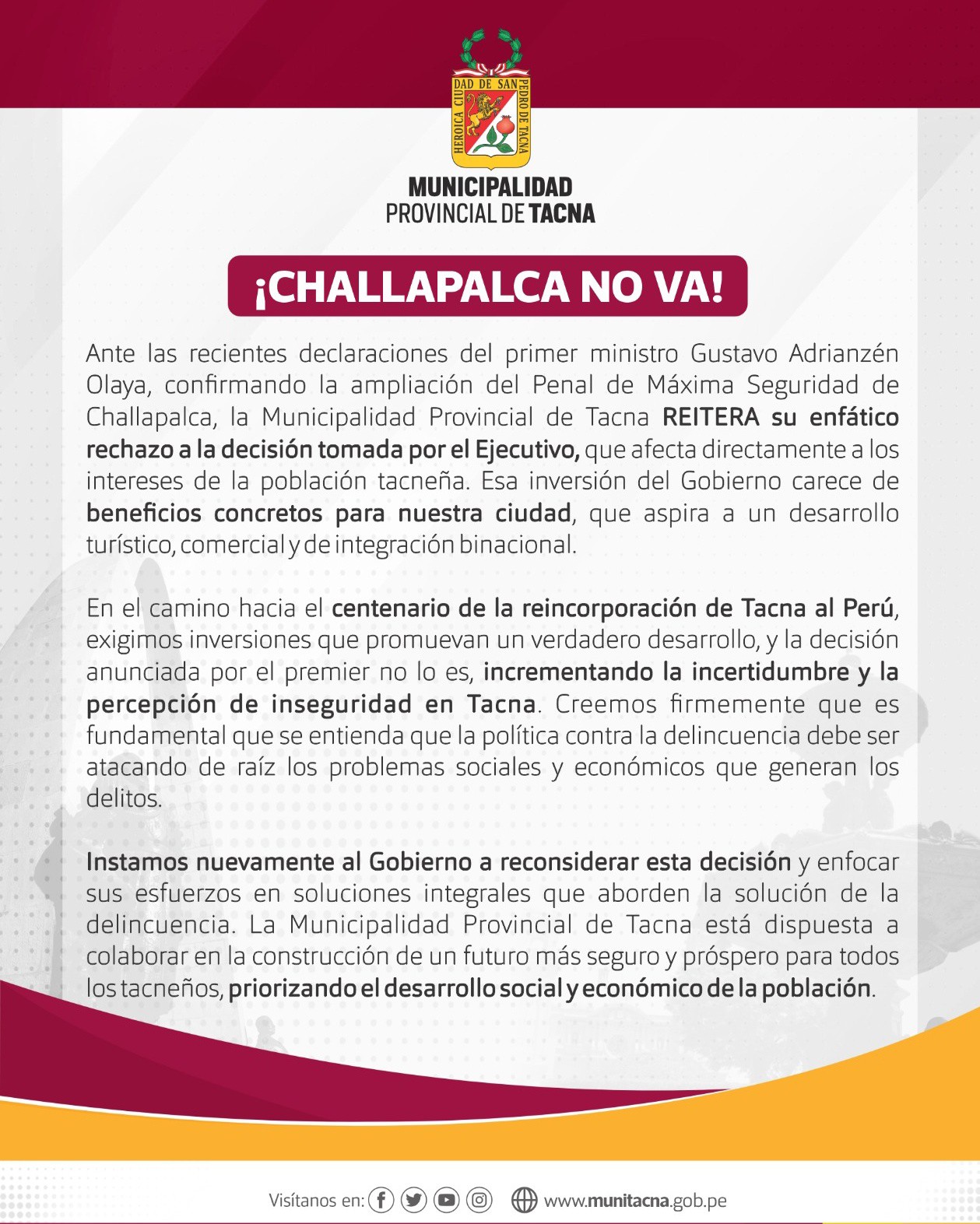 A través de un comunicado oficial, las autoridades municipales han señalado que la ampliación del penal contradice los esfuerzos que se vienen realizando para posicionar a Tacna como un destino turístico y comercial a nivel nacional e internacional. La inversión en infraestructura penitenciaria, argumentan, restaría recursos que podrían destinarse a proyectos que beneficien directamente a la población, como la construcción de hospitales, escuelas y vías de comunicación.