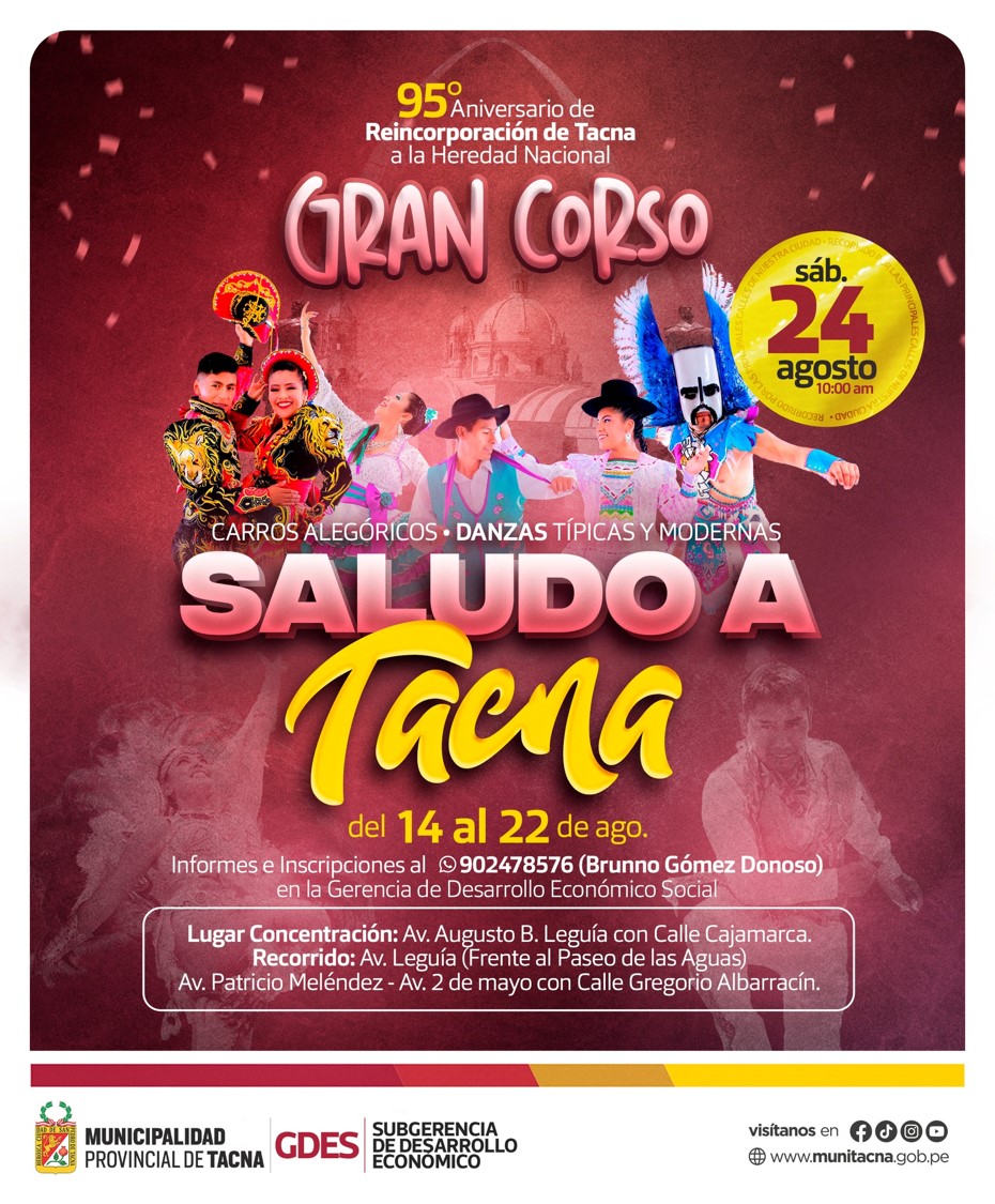 ¡Atención, grupos de danza! La Municipalidad Provincial de Tacna invita a todas las agrupaciones a participar en el Gran Corso "Saludo a Tacna", un evento que se llevará a cabo el sábado 24 de agosto como parte de la conmemoración del 95° aniversario de la reincorporación de Tacna al Perú.