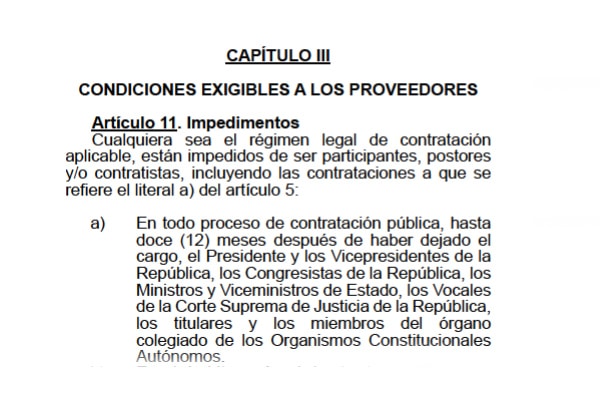 «Los ministros y viceministros de Estado, en todo proceso de contratación, mientras ejerzan el cargo; luego de dejar el cargo, el impedimento establecido para estos subsiste hasta (12) meses después y solo en el ámbito de su sector», redacta la norma.