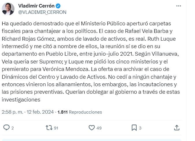 “Ha quedado demostrado que el Ministerio Público aperturó carpetas fiscales para chantajear a los políticos. El caso de Rafael Vela Barba y Richard Rojas Gómez, ambos de lavado de activos, es real”, empezó su publicación.