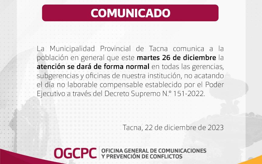 Lee más: Municipalidad de Tacna laborará el 26 de diciembre pese a ser feriado no laborable