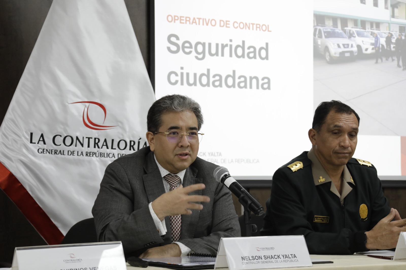 El contralor general de la República, Nelson Shack, expuso a representantes del Ministerio del Interior, la Policía Nacional del Perú y el Congreso de la República los detalles del operativo nacional #SeguridadCiudadana, que evaluará si las comisarías básicas disponen de los recursos para garantizar la protección de la ciudadanía.