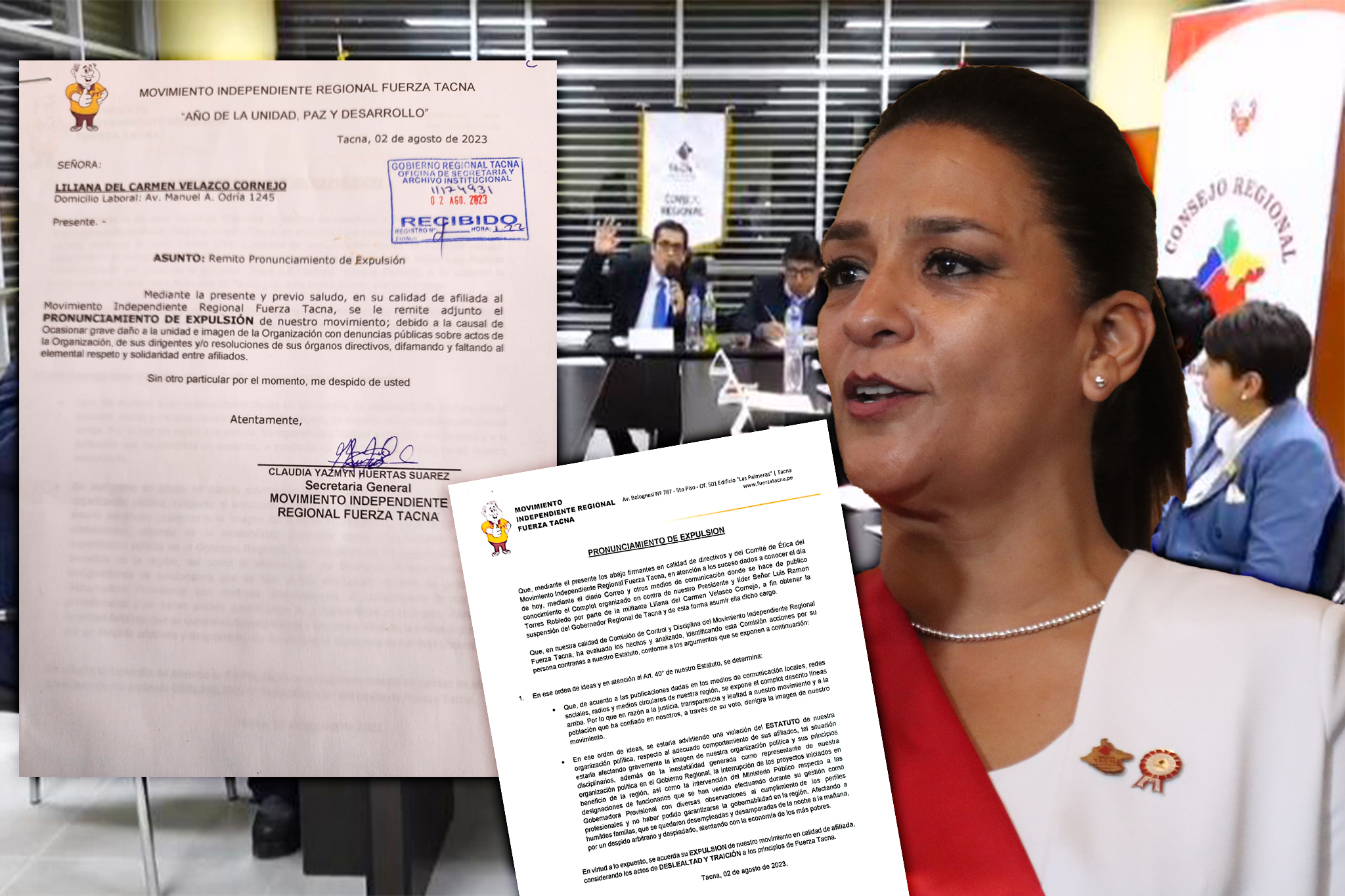 El movimiento Fuerza Tacna decidió expulsar de sus filas a Liliana Velazco Cornejo por "deslealtad y traición". La gobernadora provisional es acusada de complot en la suspensión del gobernador Luis Torres Robledo, líder del movimiento político.