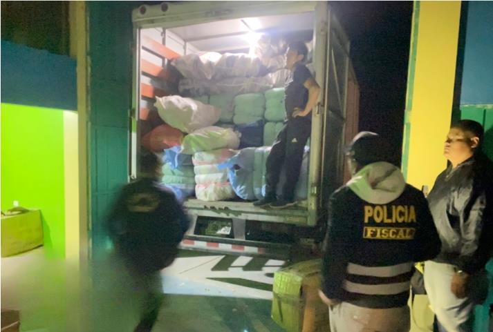 Efectivos policiales y personal de Aduanas incautaron un camión con 320 fardos de ropa de segunda mano y zapatillas en el distrito de La Yarada - Los Palos.