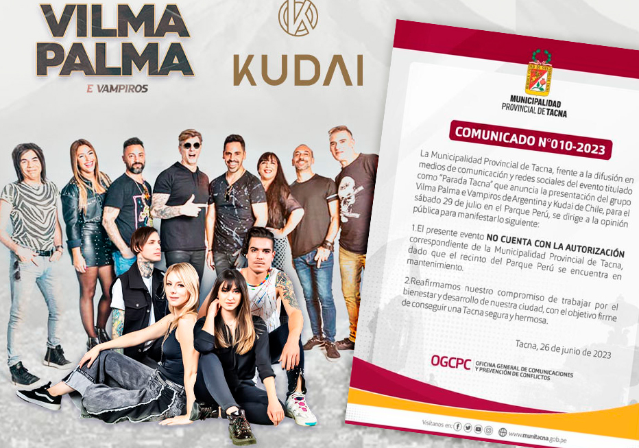 La Municipalidad Provincial de Tacna (MPT) aclaró que el evento denominado “Parada Tacna”, que anuncia la presentación de las agrupaciones Vilma Palma e Vampiros y Kudai, no cuenta con autorización. La MPT informó que el recinto Parque Perú, donde supuestamente se realizará el evento el sábado 29 de julio, se encuentra actualmente en mantenimiento.