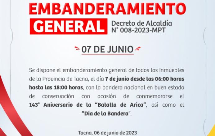 Luego de la protesta pública de los diferentes medios de comunicación, la Municipalidad Provincial de Tacna emitió un decreto convocando a todos los vecinos de la provincia a enarbolar la bandera nacional el próximo 7 de junio, de 6:00 am a 6:00 pm, en conmemoración del 143 aniversario de la Batalla de Arica y Día de la Bandera.