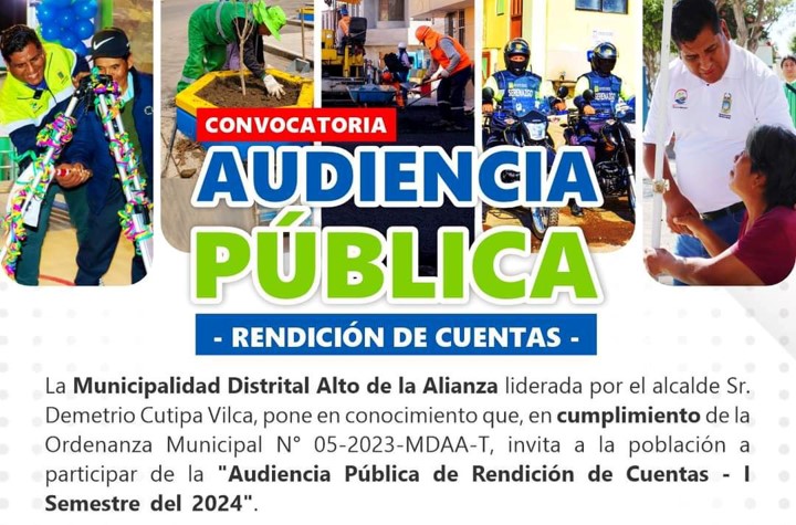 La Municipalidad Distrital de Alto de la Alianza te invita a participar en la Audiencia Pública de Rendición de Cuentas que se llevará a cabo el próximo lunes 30 de septiembre a las 8:00 a.m. en el Auditorio Central de la MDAA.