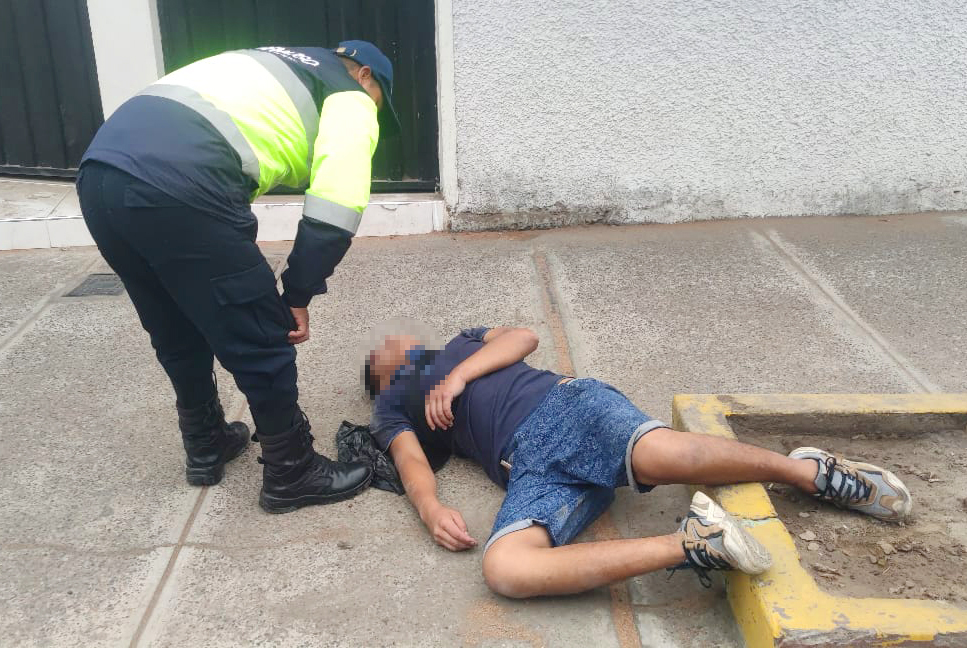 En sus rondas de vigilancia por las calles del cercado, agentes de seguridad ciudadana de la Municipalidad de Tacna se percataron a las 6:45 a.m. de la presencia de un hombre tendido en la intersección de la avenida Dos de Mayo con Unanue.