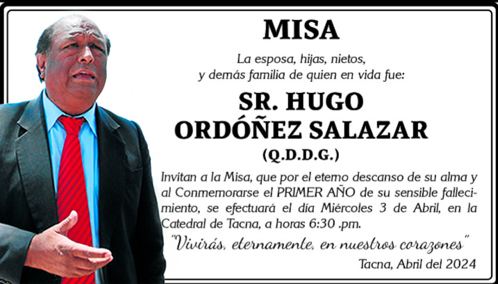La familia del Ex Presidente Regional de Tacna, Ing. Hugo Froilán Ordoñez Salazar, invita a la comunidad a la misa que se celebrará en su memoria, con motivo del primer aniversario de su fallecimiento.